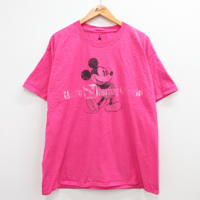 【中古】古着 ヘインズ Hanes 半袖Tシャツ メンズ ディズニー DISNEY ミッキー MICKEY MOUSE コットン クルーネック 丸首 ピンク XLサイズ 中古 中古メンズ半袖プリントキャラクター