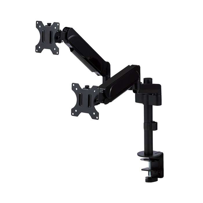 ■17〜32インチサイズのモニターに対応するガススプリング式のデュアルモニターアーム、支柱付きです。