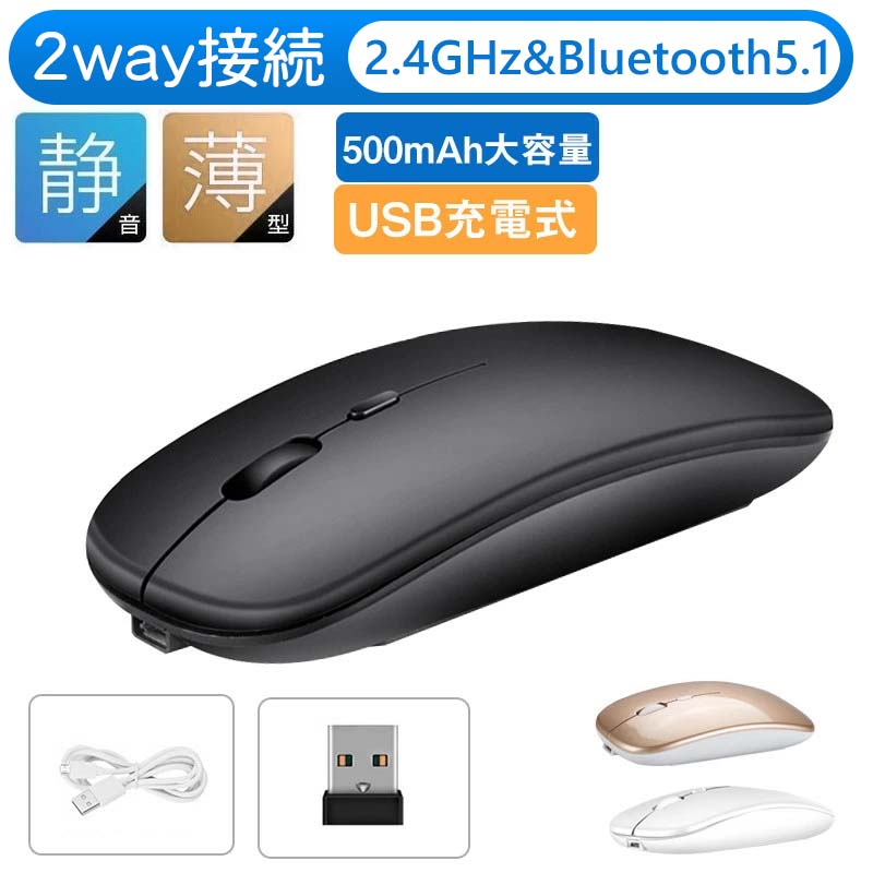 【全品P5倍+2点6%OFFクーポン】【180日保証】ワイヤレス マウス 静音 超薄型 Bluetooth5.1 マウス 2WAY 対応 充電式 電池交換不要 無線 2.4GHz 3DPIモード バッテリー内蔵 充電式 光学式 高機能 高精度 マウス TELEC認証取得済み