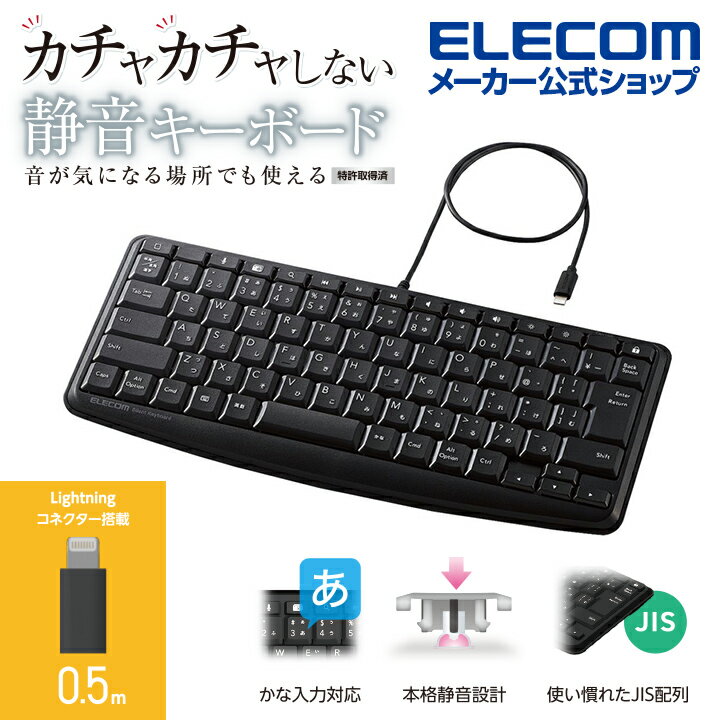 ■その他:MFi取得ずみエレコムダイレクトショップ音が気になる場所や時間帯での使用に最適!JIS配列に準拠した本格静音設計採用のLightningコネクター搭載コンパクト有線キーボード! Lightningコネクターを搭載したコンパクトな有線キーボード Lightningコネクターを搭載したコンパクトな有線キーボードです。