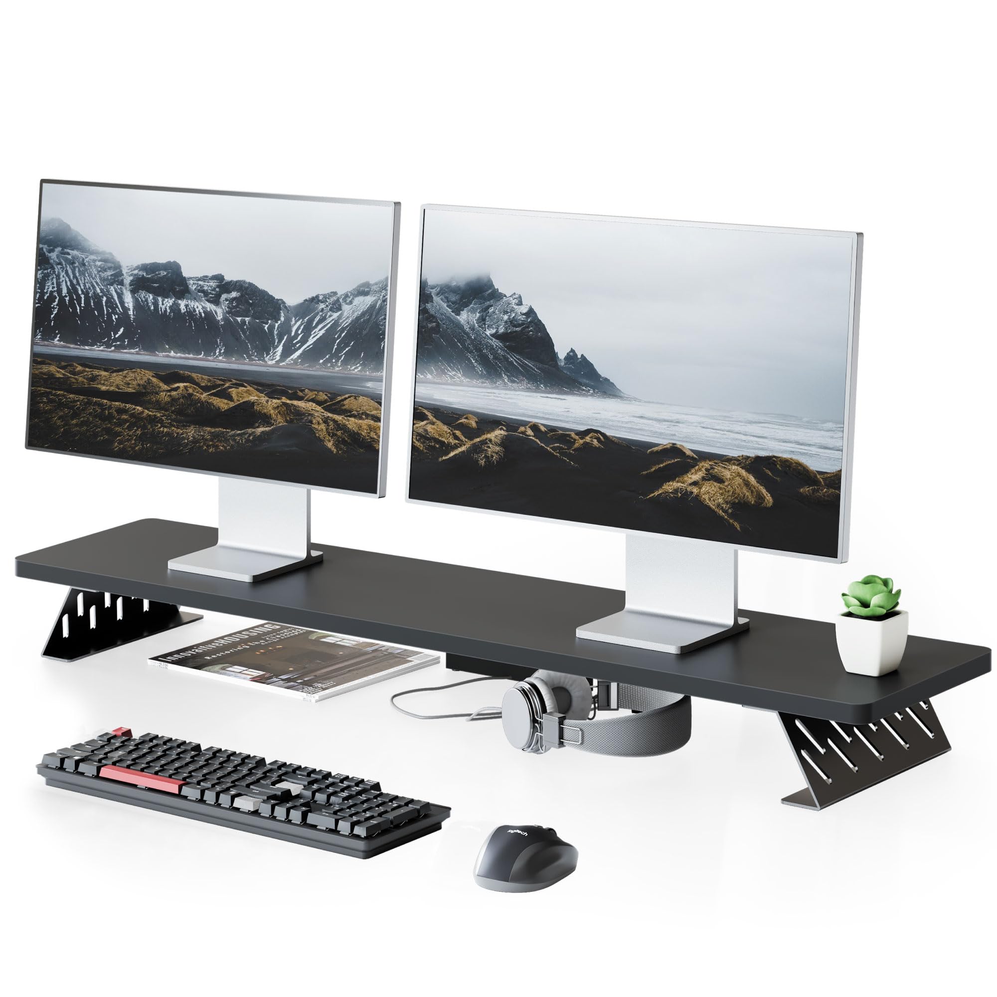 Fenge モニター台 卓上 モニタースタンド デスクシェルフ パソコン台 木製 スチール製 pc モニター台 机上台 卓上ラック 机上ラック デスク周り収納 (ブラック, 108cm)