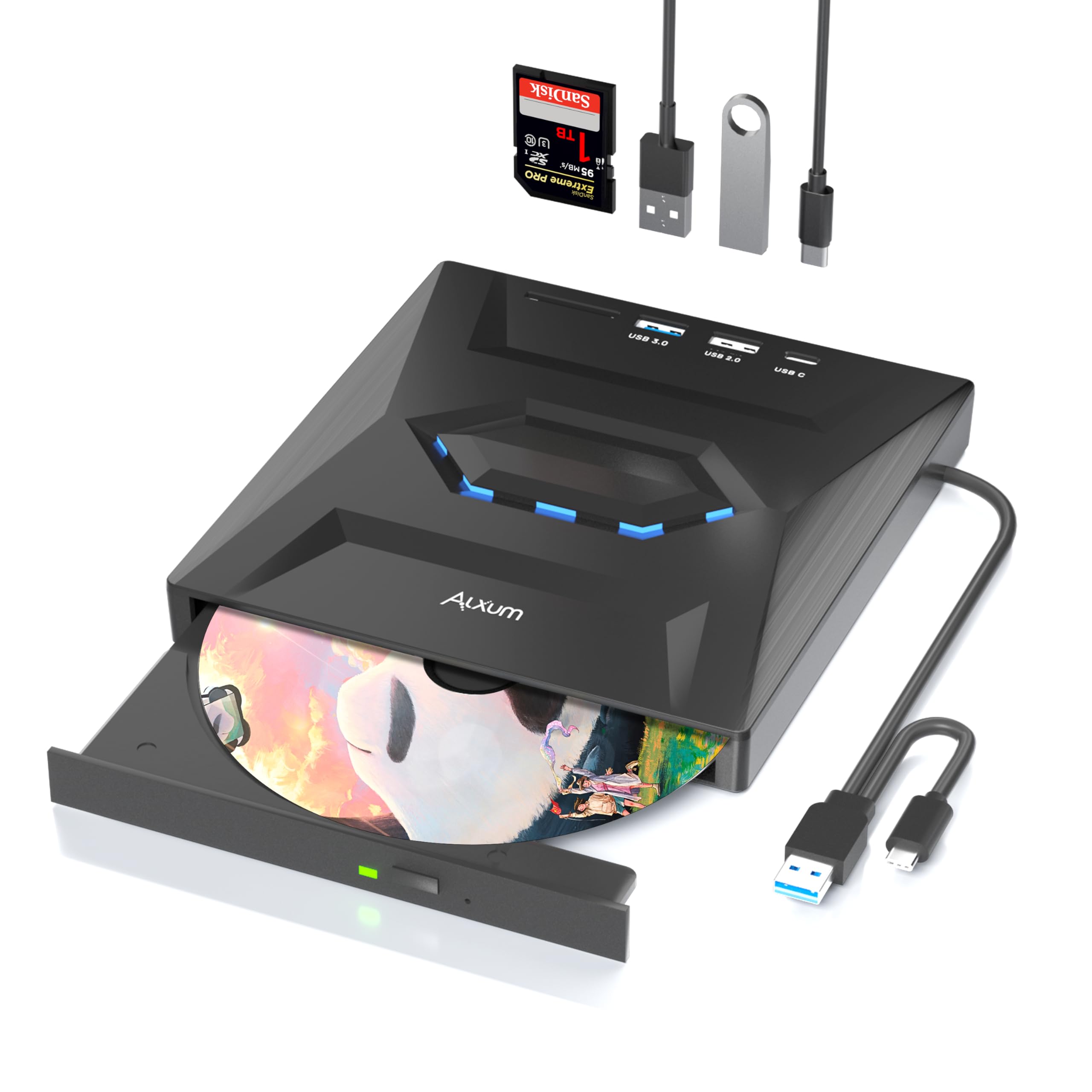 Alxum 超高速 CD/DVD ドライブ 外付け-ノートPC/デスクトップPC専用,5-IN-1 USB Type-C/USB 3.0 Aポータブル DVD 8倍速 CD 24倍速 レコーダー、SDスロット搭載、PC CDドライブ 外付け Window/