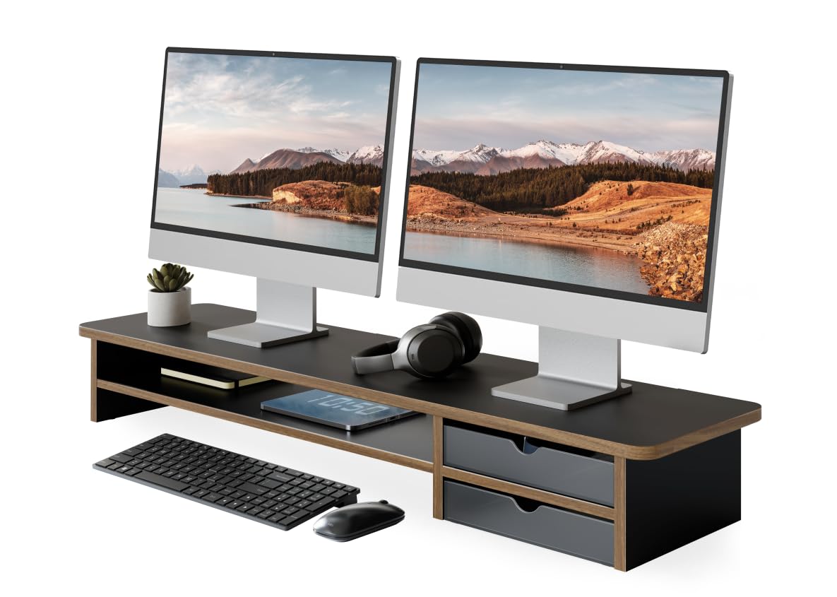 Fenge モニター台 卓上 モニタースタンド パソコン台 机上 2段 108cm 引き出し 木製 アクリル製 pcモニター台 ディスプレイ台 机上ラック 卓上収納 pc台 (黒)