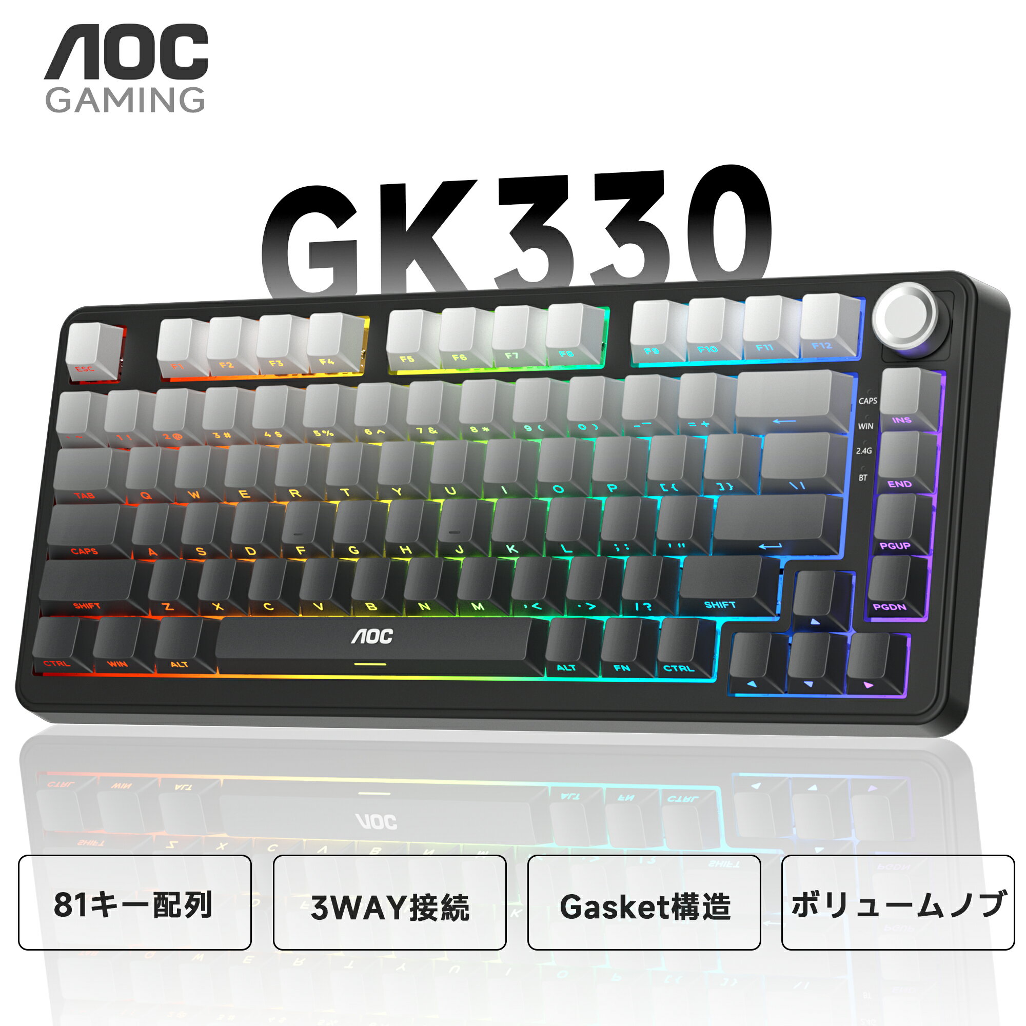 関連キーワード(本商品の説明ではありません):AOC キーボード メカニカルキーボード ゲーミングキーボード|無線&有線3WAY接続|英語配列|ボリュームノブ搭載|81キー|Gasket ガスケットマウント構造・RGBバックライト|PBTキーキャップ・ホットスワップ